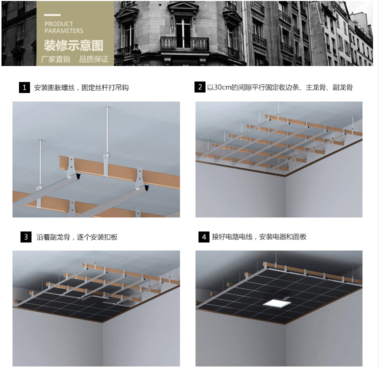1.鋁扣板吊頂從標高彈線到劃龍骨分檔線、安裝水電管線、安裝主龍骨、安裝次龍骨、安裝吊頂面板、收邊墻線最后到安裝壓條,施工工藝的每一步技術要求都比較高。除了扣板的質量,如果安裝師傅技藝不精,比如安裝一條一條扣上的條形扣板,通常會出現扣板接縫不緊密;