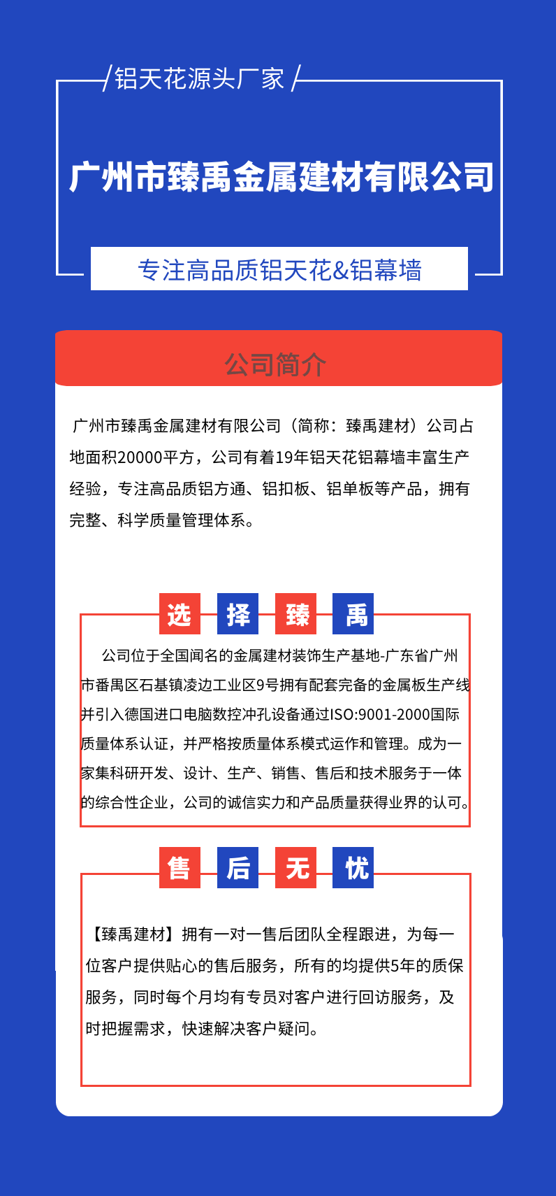 廣州市臻禹金屬建材19年專注高品質(zhì)鋁合金鋁方通、鋁扣板、鋁格柵,鋁單板 生產(chǎn)廠家,集研發(fā)、設(shè)計、生產(chǎn)、銷售、售后、服務(wù)一體,是眾多大型企業(yè)工程指定供應(yīng)廠家,通過并執(zhí)行1S09001:2000國際質(zhì)量體系認證,是國內(nèi)規(guī)模實力雄厚、產(chǎn)能產(chǎn)值大、配套完善。